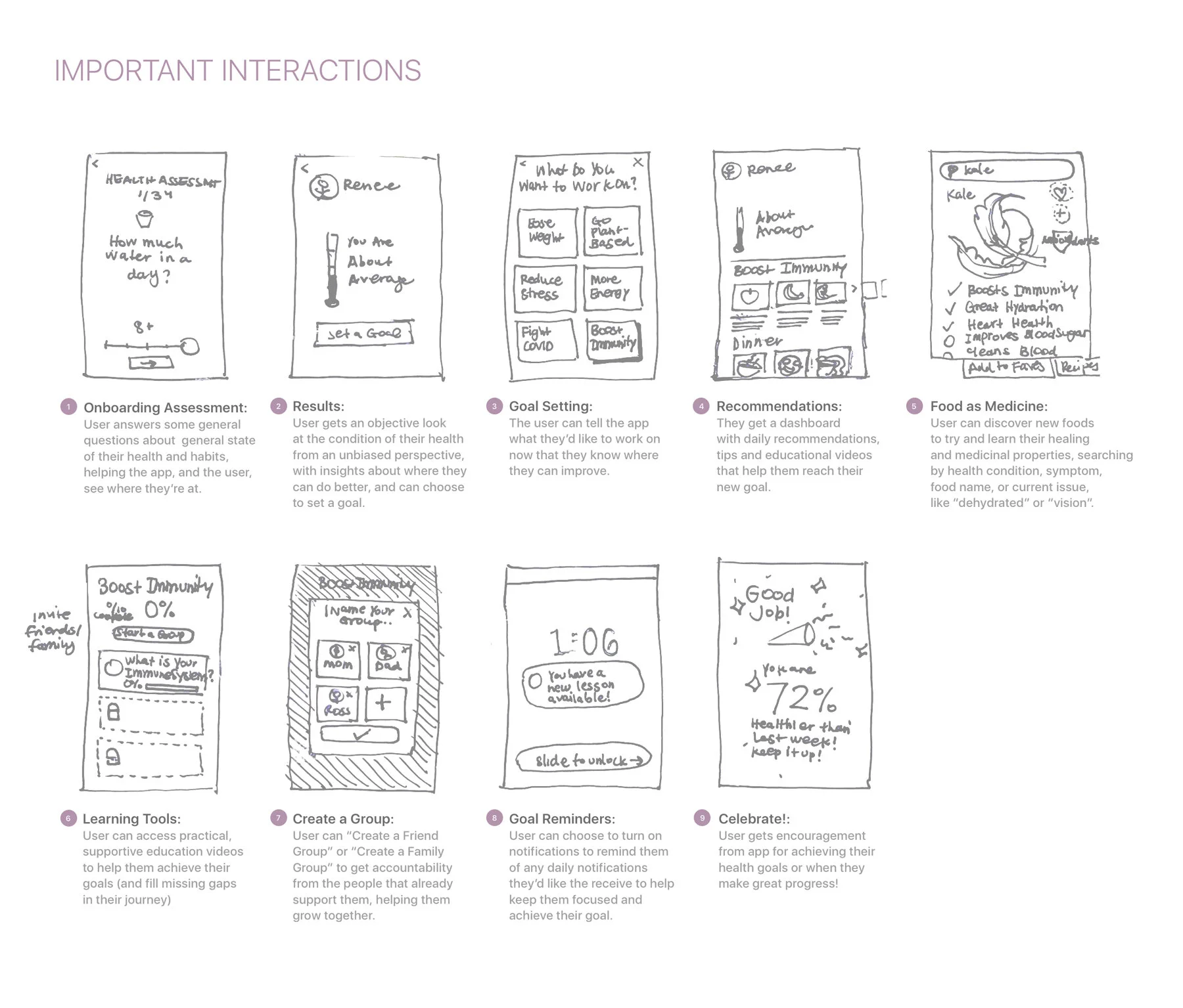Insight #3: We need help recognizing self-made barriers to our own healing. In one interview, I interviewed a naturopath who listens to peoples’ health problems on a daily basis. He was dealing with sciatica issues from work issues, and after thinking about it, realized that he often takes care of everyone else but forgets about taking care of himself, and one way the app could support him would be to help him recognize more ways that he could take care of himself, suggesting notifications for reminders and recommendations on how to incorporate more supportive work habits into his lifestyle to improve his health when work seems to be a barrier to healing.
