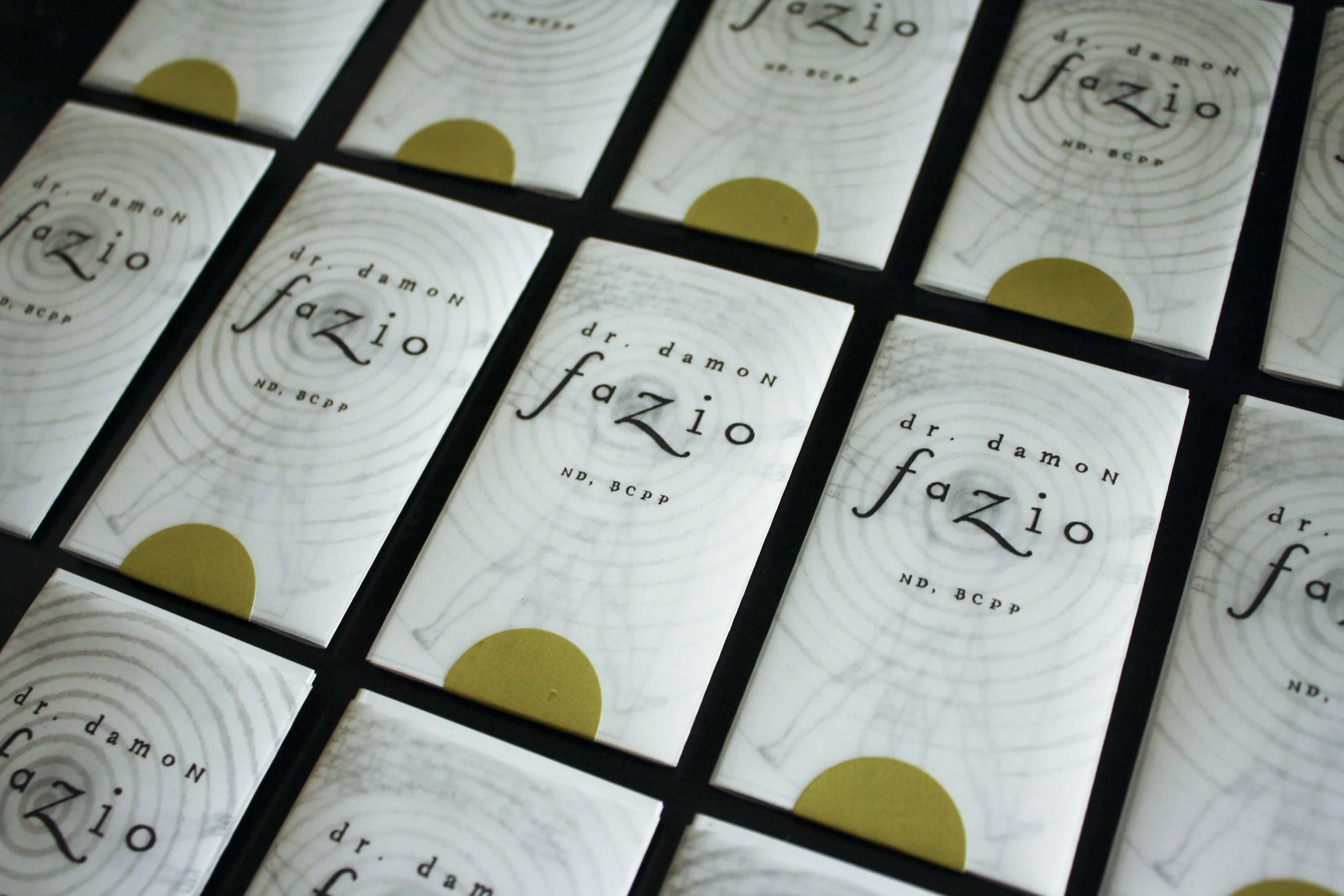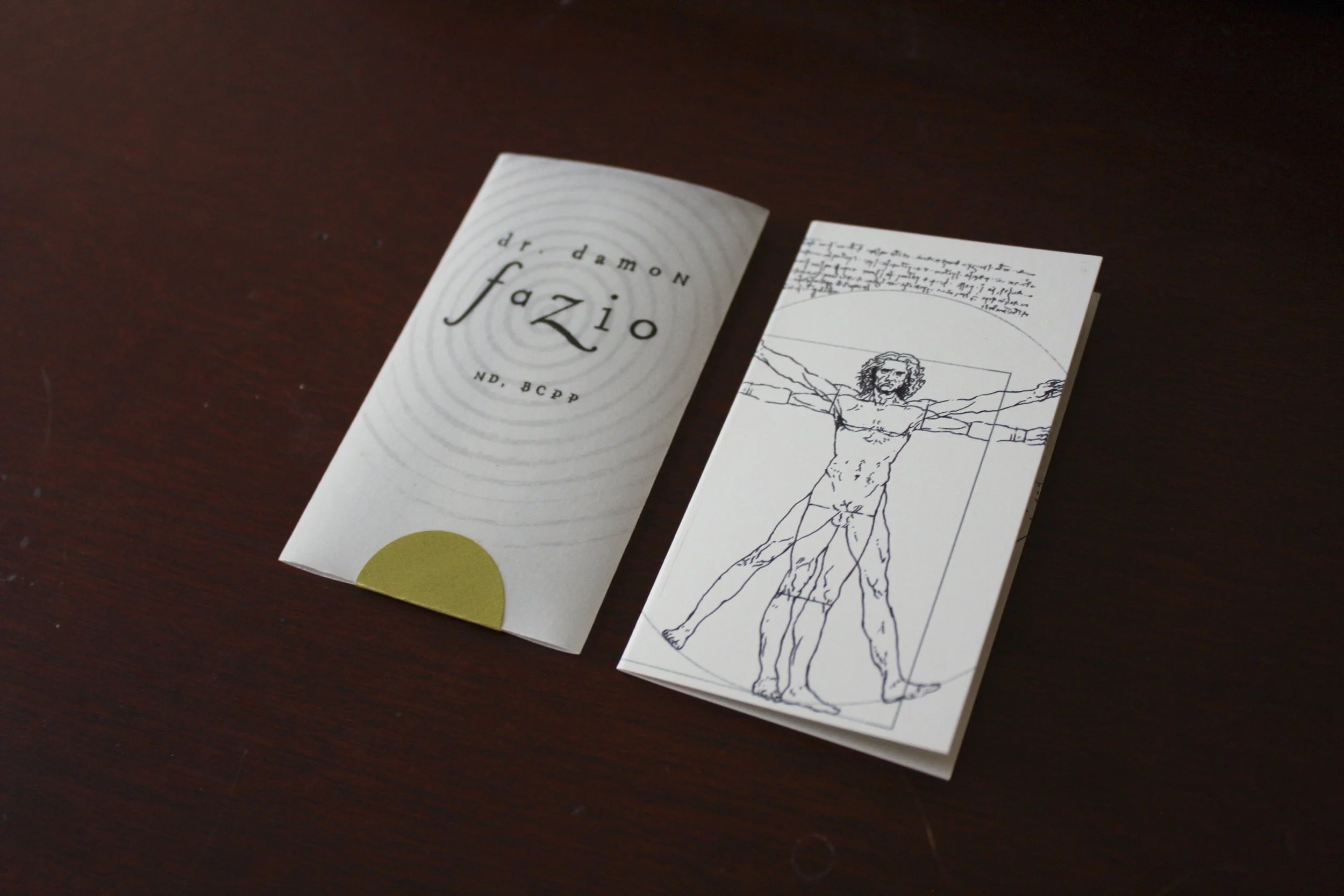 Business cards were designed with a semi-transparent vellum sleeve, meant to depict the invisible energy field Dr. Fazio works with as a part of, but separate from, the body. The Vitruvian man was hand-drawn then digitized so it could be used as brand elements elsewhere.