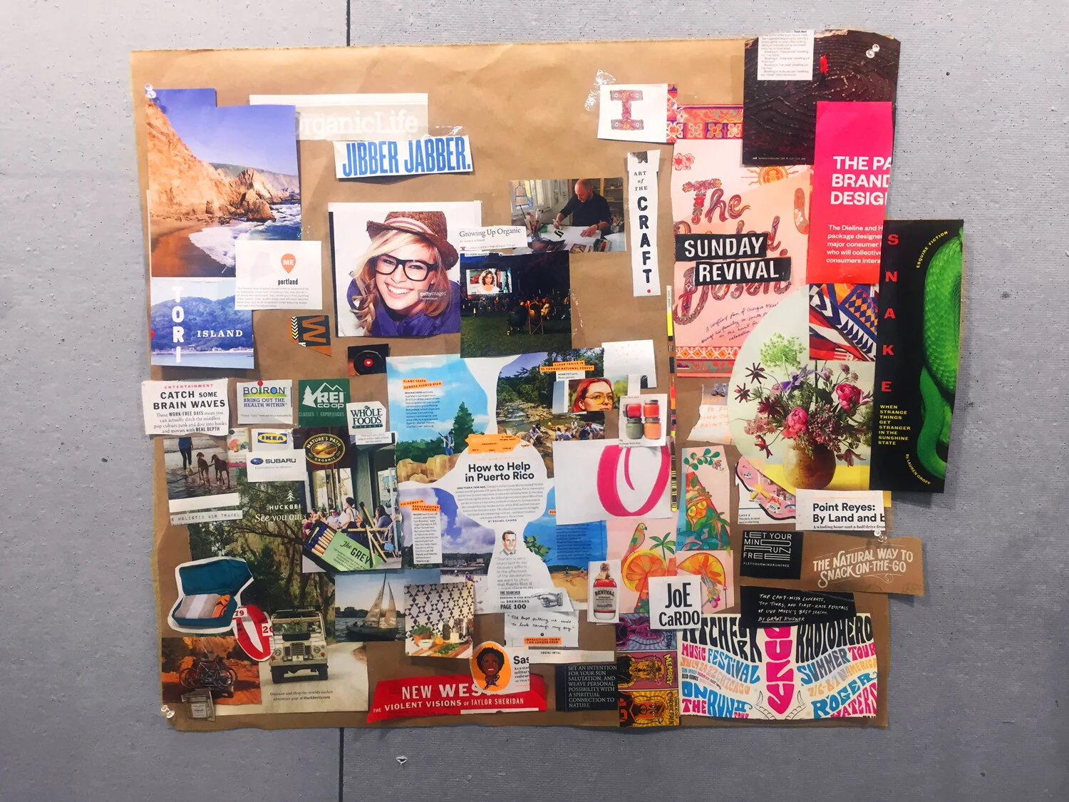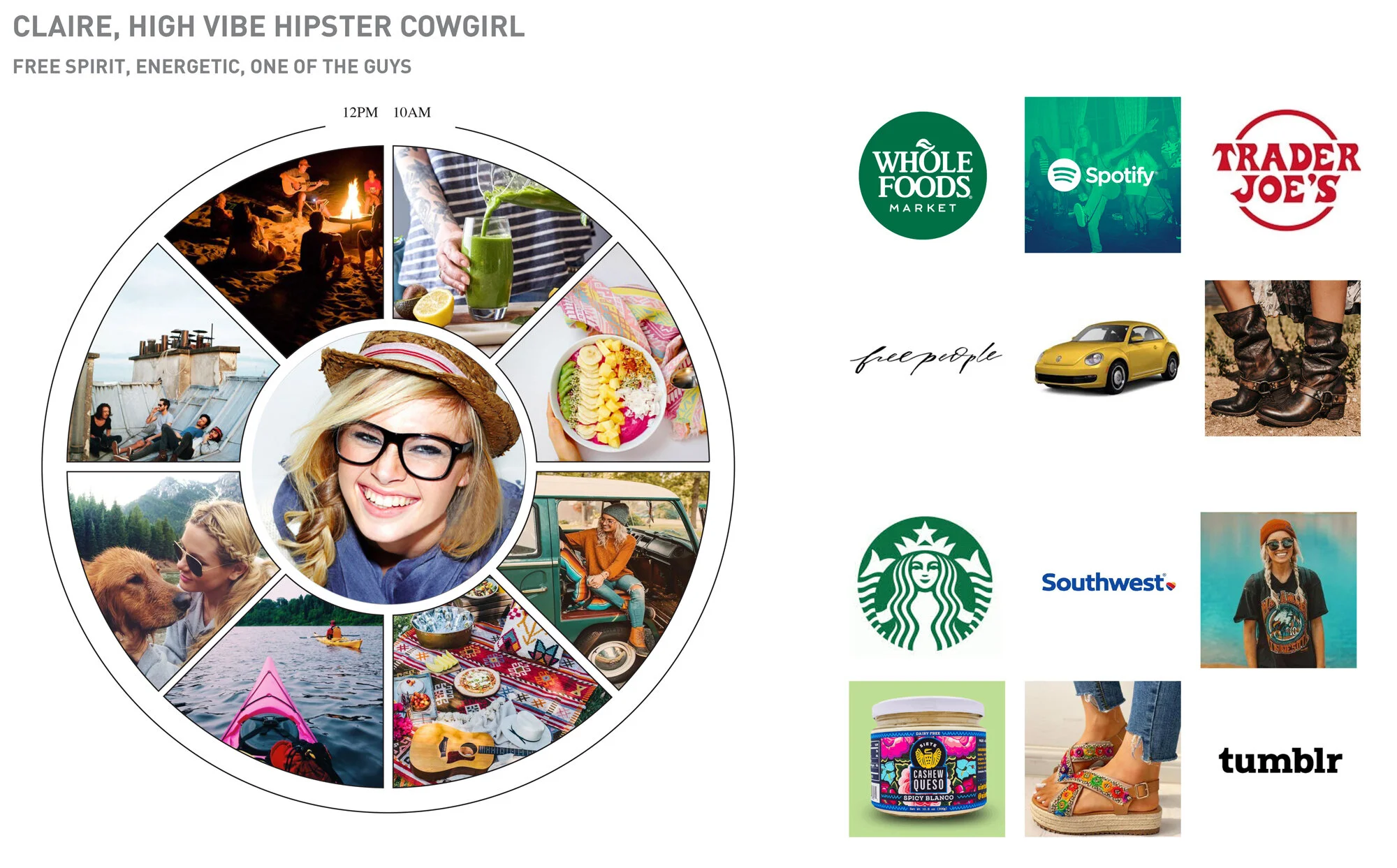 Customer persona mapping for Claire — getting a better sense of who she is, what a typical day might be like, her favorite brands, places to shop, and things which she might feel are important to her identity. Based on this information, I settled on a Kombucha health drink to design for, and got started concepting the packaging.