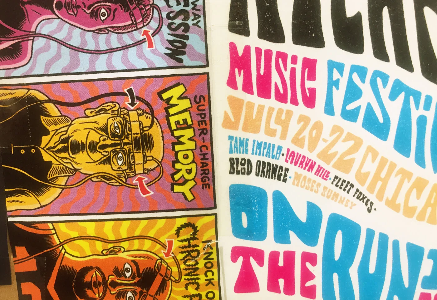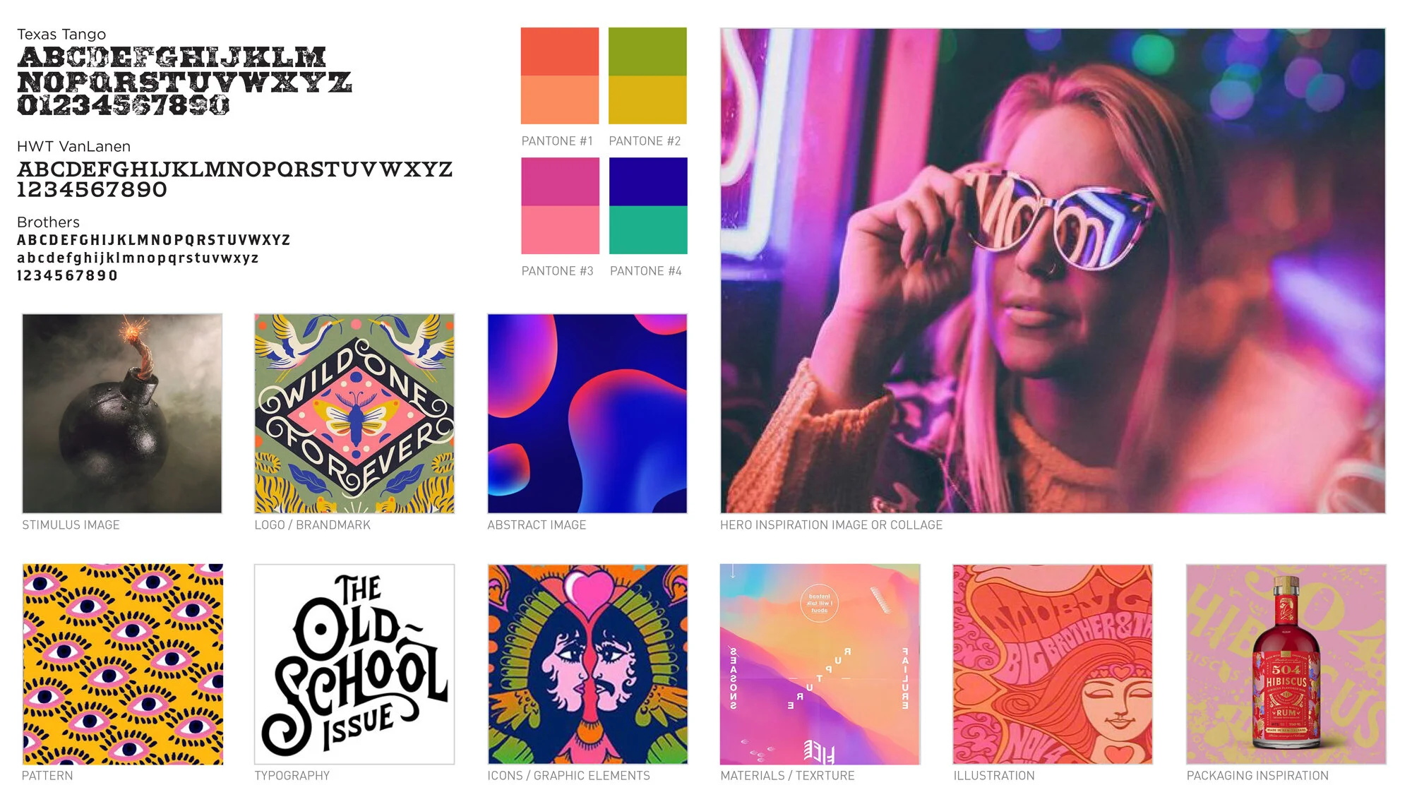 Concept board took inspiration from elements of the mood board, inspired by her festival-going, psychedelic, hippie style. Initial concepting included heavy old school typography.